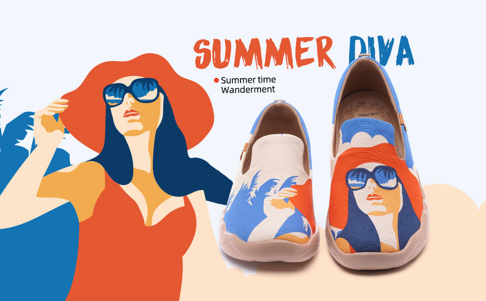 This adorable pair of shoes is going to become your best buddy in your closet during this summer and all the others! It portrays a classic diva with a very striking, bright red colored hat that spaces from the left shoe to the right one. This is one of the best piece of our ”Tropical collection, no doubt on that! A nice detail for you to spot: on the sunglasses you can see a shade of blue, which represents the sea in front of you.